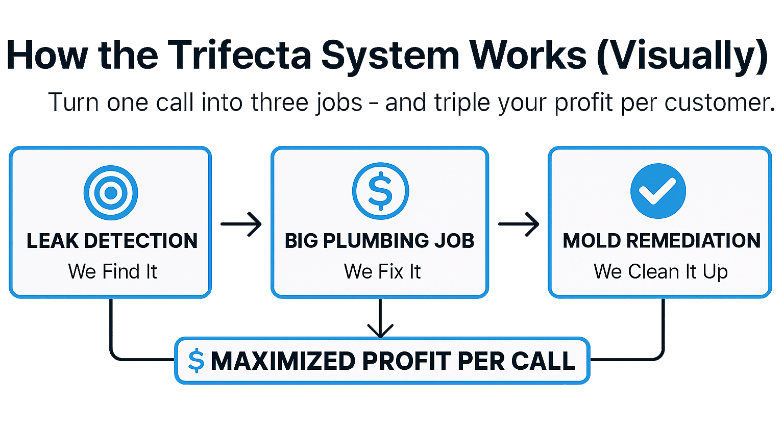The Trifecta is a revolutionary system where plumbers learn and leverage leak detection in order to sell more big plumbing jobs. Also, it's a natural flow to turn those jobs into highly profitable mold remediation and water restoration jobs.